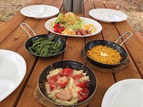 前菜には、キャンパーズキッチンで出している野菜サラダにスモークたまご・チーズ・ウインナーの盛合わせ。